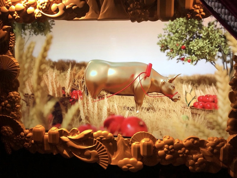 “五谷豐登”櫥窗主題色為麥浪金。滿眼的累累碩果讓人忍不住想伸手一摘,甜香的桂花仿佛一瞬間沁人心脾,勤勤懇懇的耕牛最后出現(xiàn)在畫面中央,不失為一幅田野豐收?qǐng)D。
