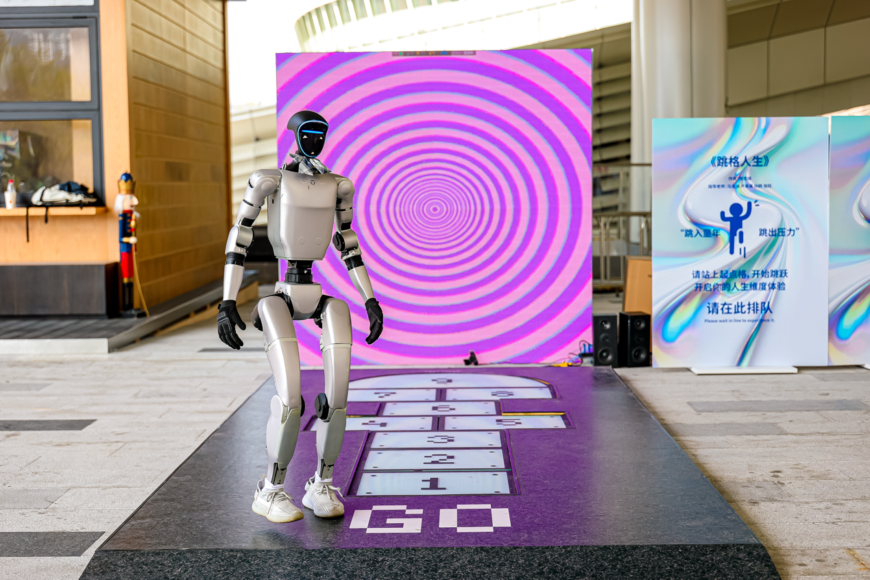 另一件備受關注的新質影像代表作品是由香港數字藝術家周也山創作的裝置作品《灣區之眼》。作品以“天圓地方的當代凝視”為核心概念,結合裸眼3D與AI光影技術,在投影中交織傳統紋樣與灣區數字肌理。通過動態光影的變化,以“方靜圓動”詮釋文化根基與創新精神的融合。深圳青年藝術家何思琦的互動作品《跳格人生》以“跳房子”為靈感,引導觀眾通過身體參與喚醒記憶與情感,讓藝術真正走進城市生活。